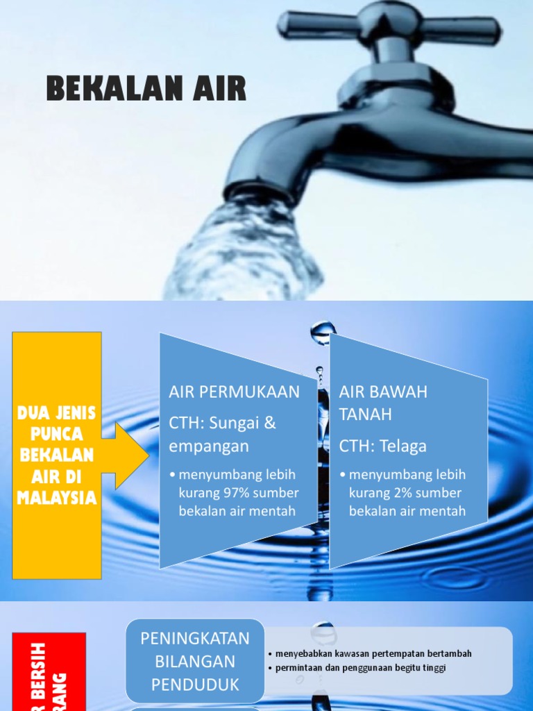 -Sebagai contoh penyakit bawaan air ialah taundemam kepialu dan leptospirosis. Menjelaskan dengan contoh punca krisis air di Malaysia 121 JENIS-JENIS SUMBER AIR Kadar hujan di Malaysia 2 500 mm hingga 3 000 mm setahun. Mengenal pasti jenis sumber air di Malaysia 2.